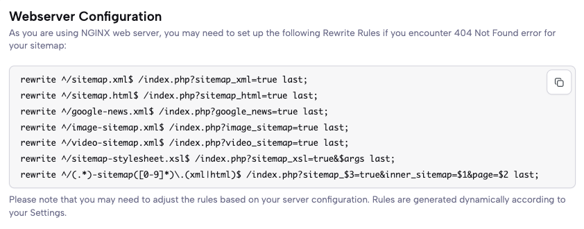 If you are using NGINX web server, Webserver Configuration section will be appeared under General settings. You may also need to set up the following Rewrite Rules if you encounter 404 Not Found error for your sitemap.