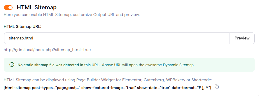 Enable an HTML version of your sitemap, customize its output URL, and preview it. This HTML sitemap serves as an alternative to the XML sitemap and is not intended for indexing purposes: