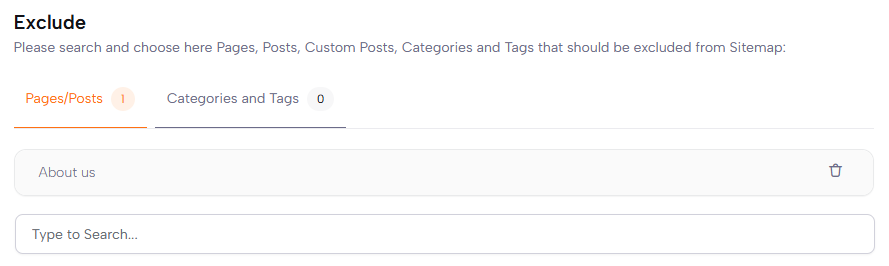 Easily exclude specific Pages, Posts, Custom Posts, Categories, and Tags from your sitemap using the autocomplete search feature: