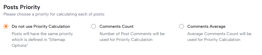 Do not use Priority Calculation: Posts will maintain the same priority as defined in Sitemap Options.